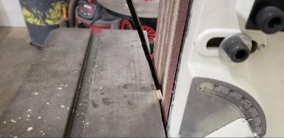 If a workpiece is presented to the abrasive in an upward-facing angle, it can be forcibly pushed down and out away from the machine, posing an impaling hazard. Keep the workpiece flat against the table. Angled sanding can be done by flipping the workpiece on edge and presenting it at a 45 degree angle, or by angling the entire table.