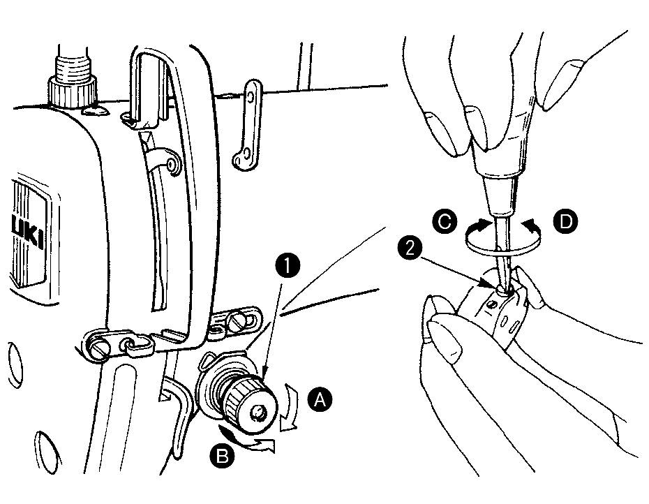 - Turn tension adjustment screw 2 counterclockwise (in direction D), to decrease bobbin thread tension.