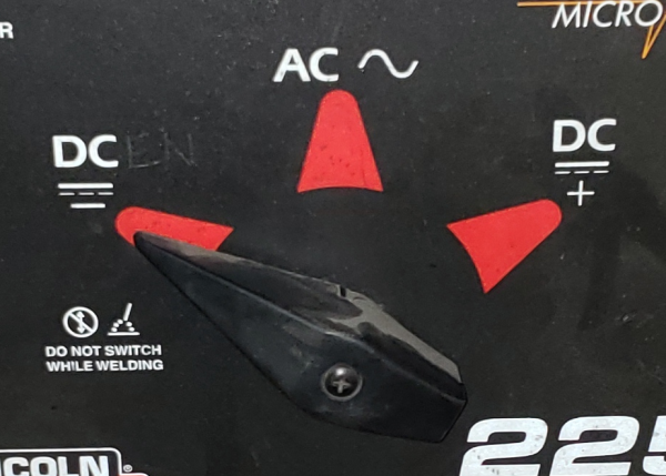 2. Polarity Selector - This selector allows the user to define whether the torch electrode is always negative (DCEN), always positive (DCEP), or alternates between positive and negative (AC). Most steel wil be welded in DCEN, and most aluminum will be welded in AC.