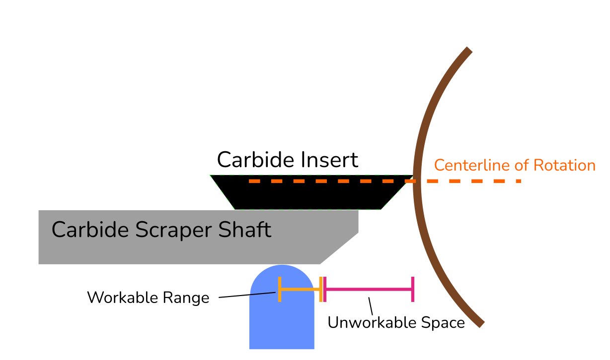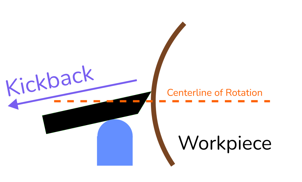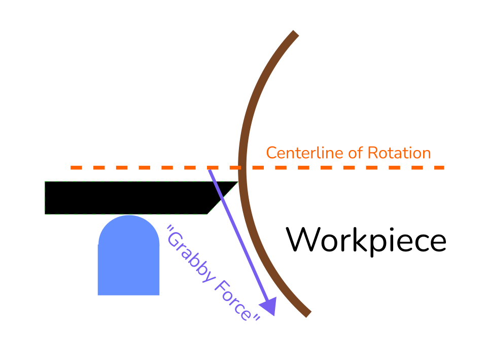 ⚠️ Introducing the tool below the centerline will increase the risk of a catch. With the material moving angularly away from the tool it will have a tendency to grab the tool and pull it deeper into the work.