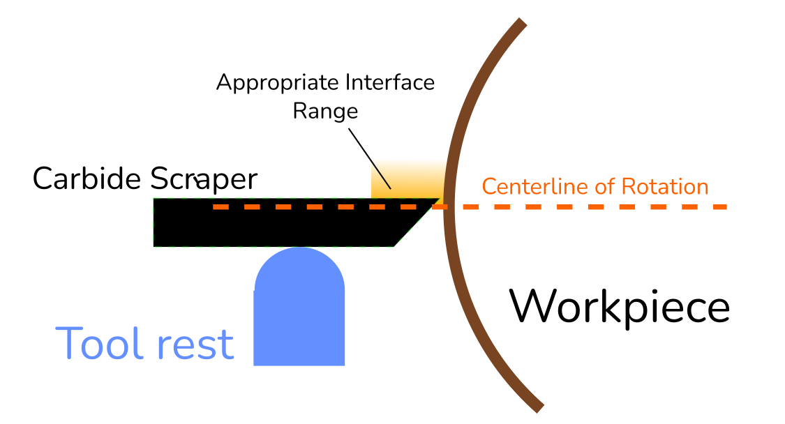 ⚠️ Angling the scraper up into the workpiece will have a similar effect to raising the tool rest but there is an increases risk of tool kickback as the forces aren't perpendicular to the tool rest.
